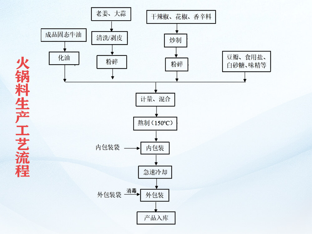 熬製成品經配製混合均勻的各種原料倒入已經過化油處理後的液態牛油中,並在熬煮鍋進行熬製,溫度控製在150~180℃左右,約30分鍾至香味溢出且呈紅褐色時熬製完成即為火鍋底料產品。